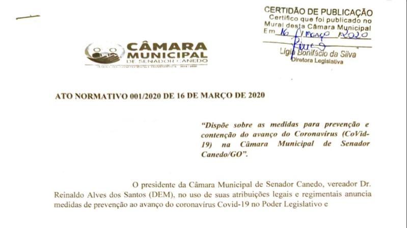 O presidente da Câmara de Senador Canedo, dr. Reinaldo Alves, assinou, agora pela manhã, ato normativo que anuncia medidas preventivas ao avanço do Coronavírus Covid-19, conforme recomendação da Organização Mundial da Saúde.