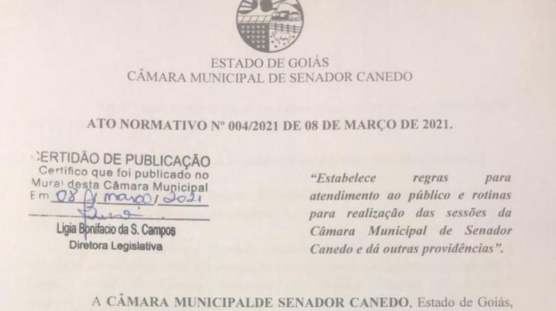 Estabelece novas regras para atendimento ao público e rotina para realização das sessões da Câmara de Senador Canedo.